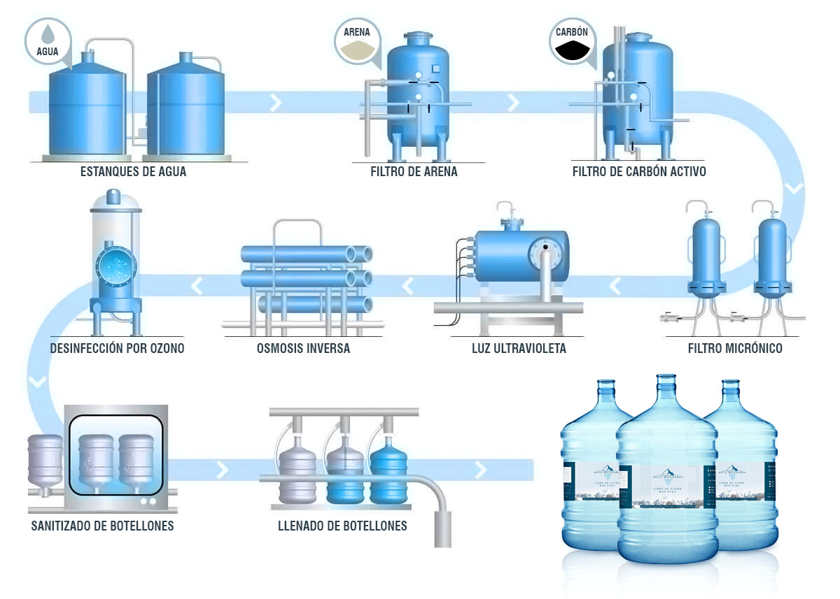 Nuestra purificación principal, además de Filtro de Carbón Activo y tratamiento UV, es la OSMOSIS INVERSA, la cual Proporciona un agua de excelente calidad y magnífico sabor, se consigue un elevadísimo porcentaje (hasta el 99 %) de retención de los contaminantes del agua, tanto disueltos como no disueltos.